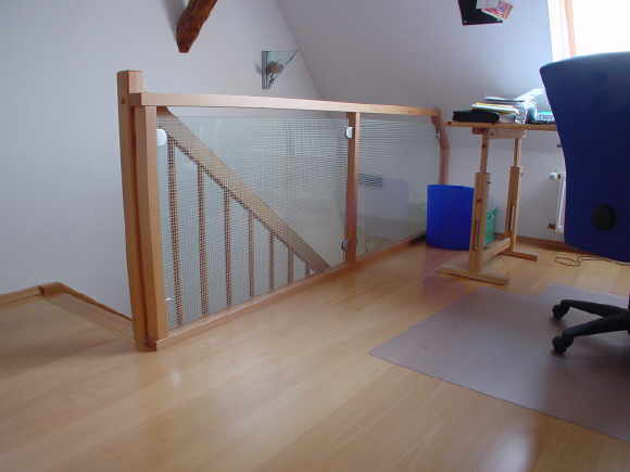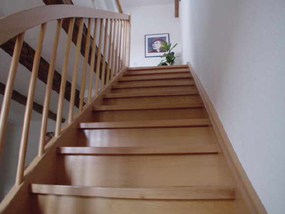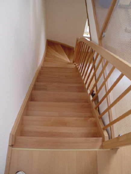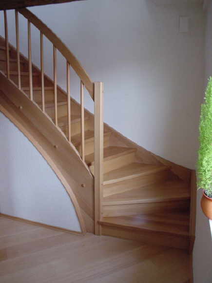 Massivholztreppe mit 1/4 Schwung, unten (gestemmte Wangen mit Setzstufen)) Wangen und Stufen in Buche Doggen und Pfosten in Buche