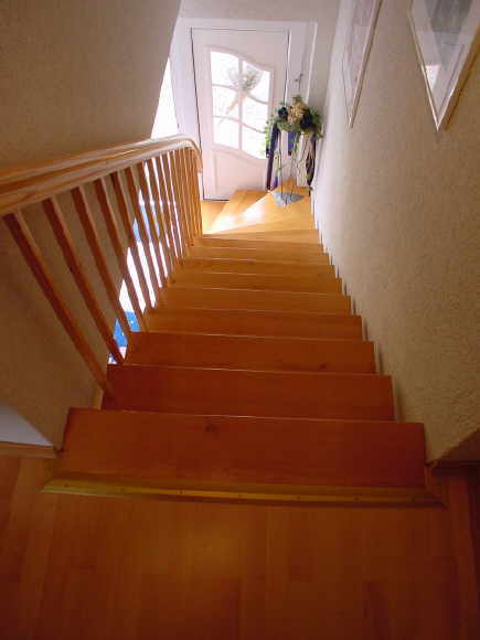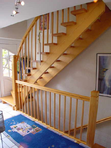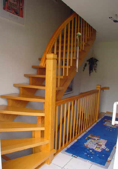Massivholztreppe mit 1/4 Schwung, unten (aufgesattelt) Wangen in Caroliner Pine Stufen in Buche Doggen und Pfosten in Caroliner Pine