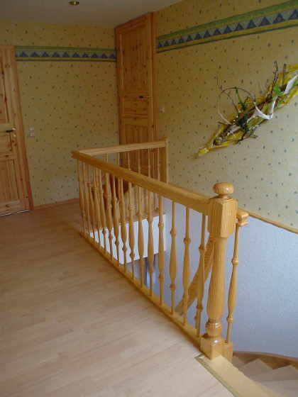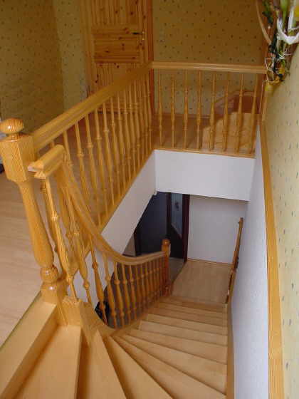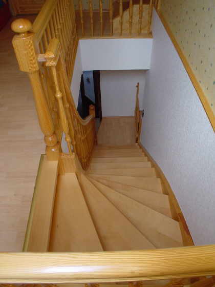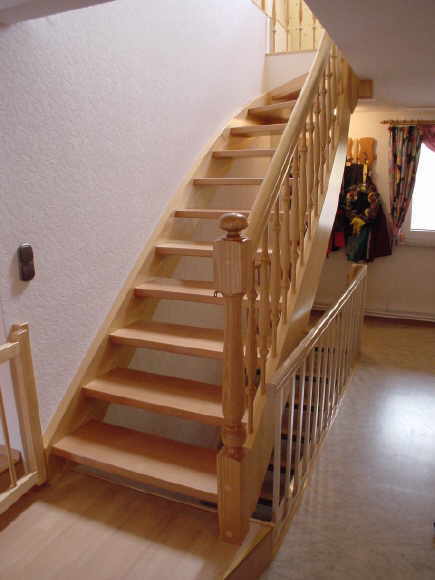 Massivholztreppe mit 1/4 Schwung, oben (gestemmte Wangen ohne Setzstufen)) Wangen in Caroliner Pine Stufen in Buche Doggen und Pfosten in Caroliner Pine